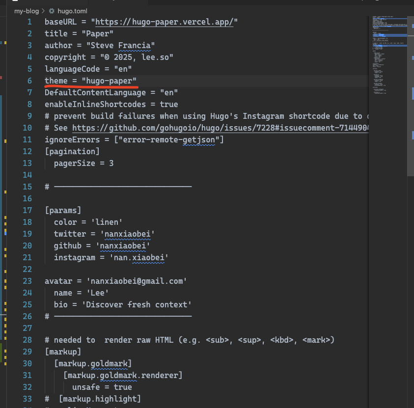 然後在你的my-blog資料夾中,找到hugo.toml,找到