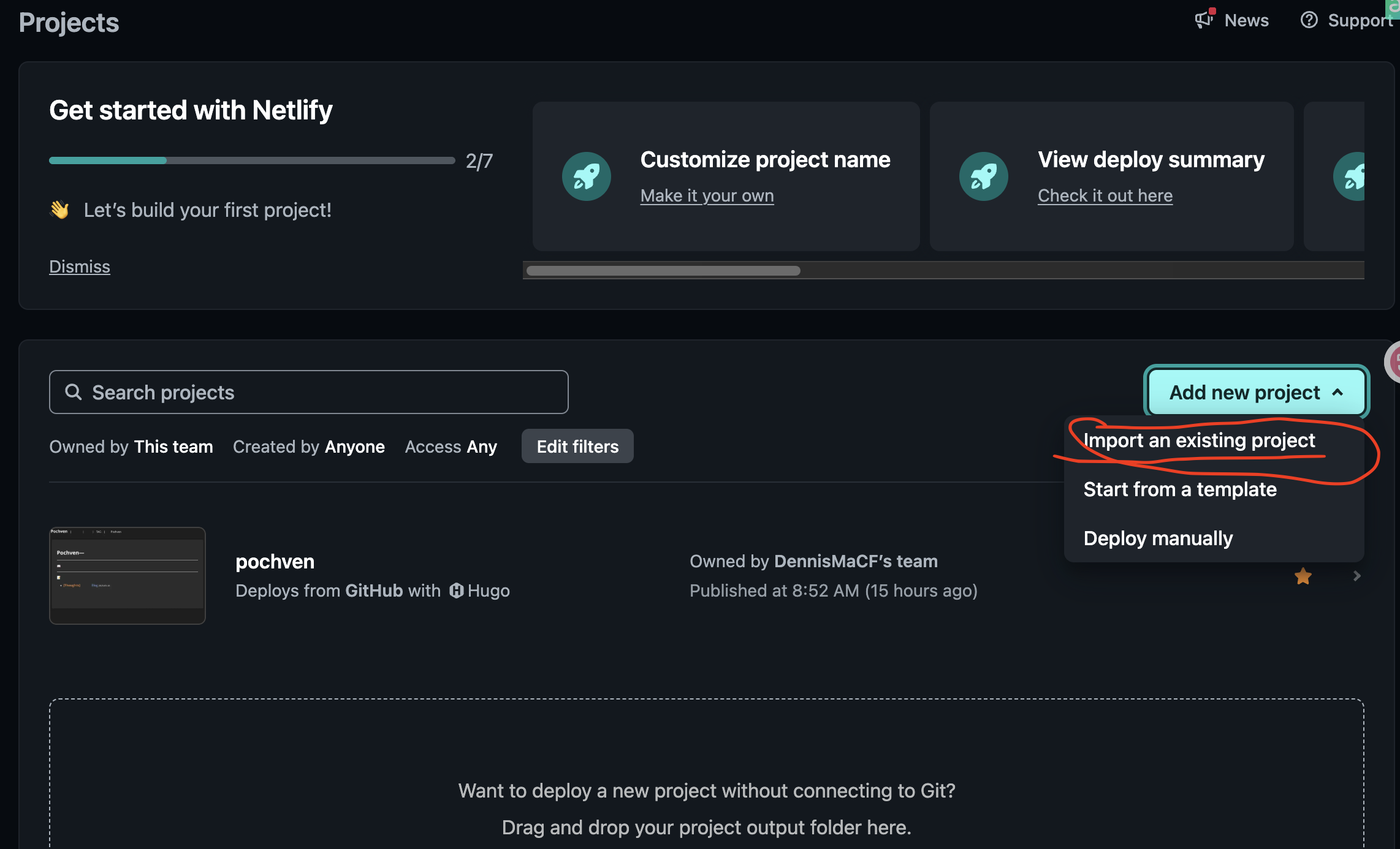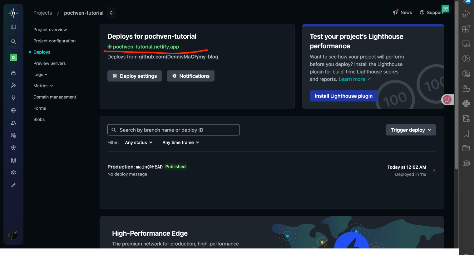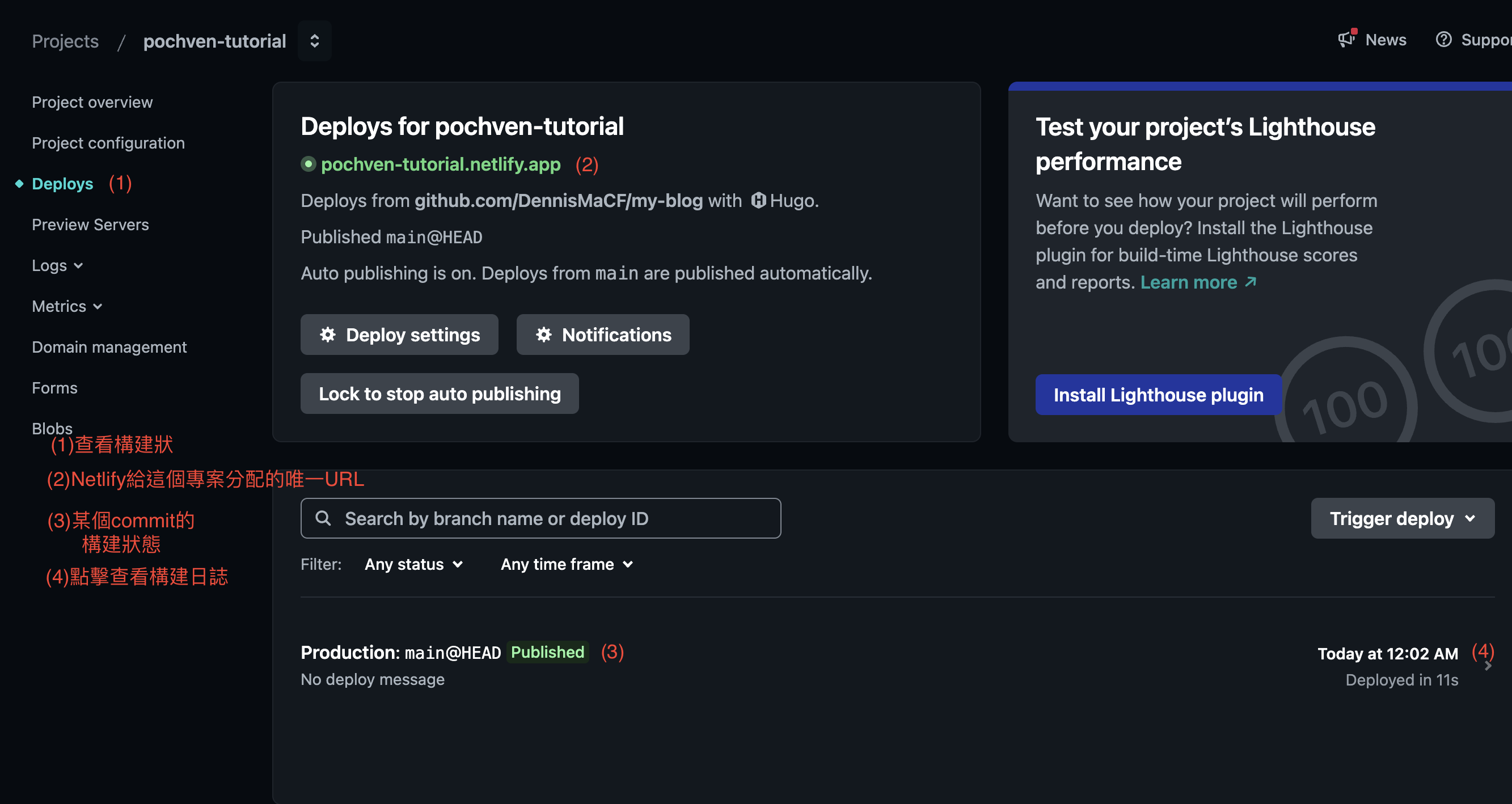 (4) 點擊劃線部分,便可以使用 Netlify 提供的唯一 project_name.netlify.app 鏈接來訪問Blog網站了!