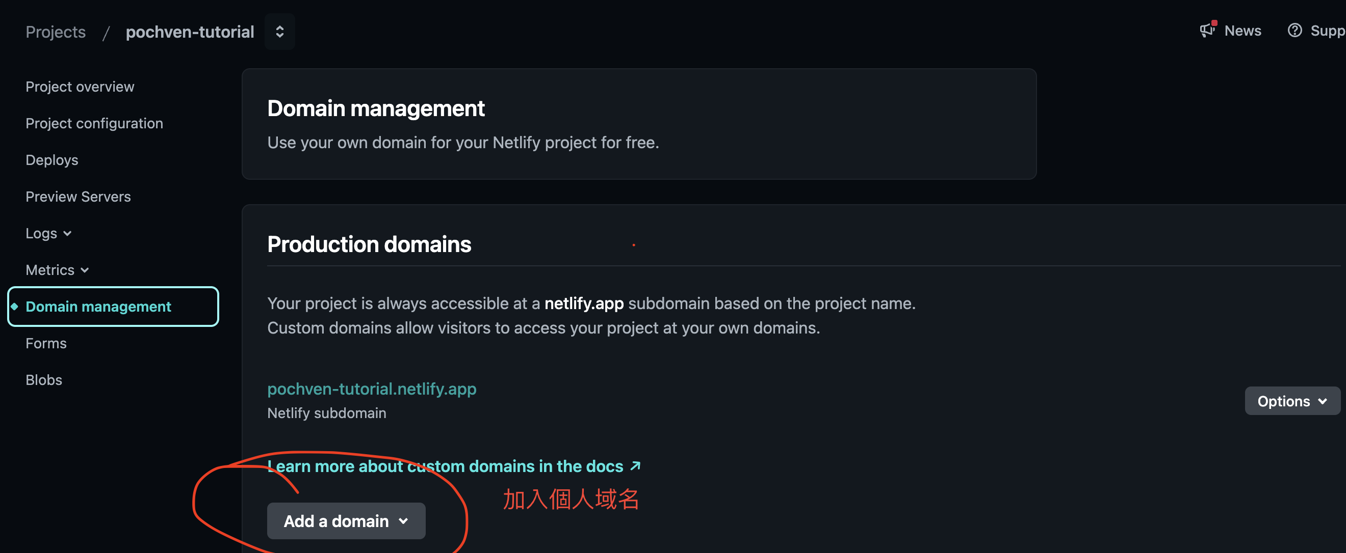 - 域名管理: Project overview -> Domain management